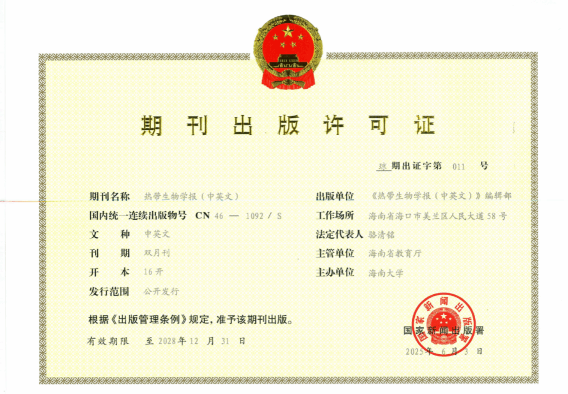 经国家新闻出版署(国新出审【2025】957号文件)批准,《热带生物学报》期刊业务范围中的文种由中文变更为中英文,国内统一连续出版物号由CN46-1078/S变更为CN46-1092/S,《期刊出版许可证》上期刊名称登记为“《热带生物学报(中英文)》”,出版单位登记为“《热带生物学报(中英文)》编辑部”。其他登记事项不变。