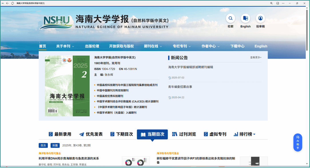 我们致力于打造一个高质量的国际化学术交流平台,促进科研成果的快速传播与共享,期待与您携手共进,推动学科发展,共创学术辉煌。欢迎访问本刊网站:https://hndk.hainanu.edu.cn/。
