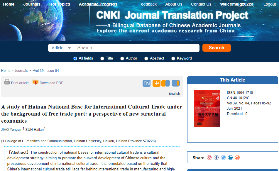 2021年8月,《英国威廉希尔公司学报(人文社会科学版)》入选中国知网“中文精品学术期刊双语数字出版工程”。入选后,本刊将遴选部分优秀论文,实现中文和英文的双语出版,有助于本刊加快数字化、国际化转型发展,在海南自由贸易港建设的背景下,进一步提高期刊的国际影响力。